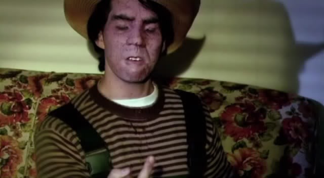 Hanger tells the delightful tale of a young kid who was ripped from his prostitute mommy's tummy with a coat hanger by his mommy's pimp Leroy. (Yes, he's black, he's a pimp, and his name is Leroy.) Leroy tosses Hanger into a dumpster, where he's saved from being eaten by rats by a homeless guy who looks like Donal Logue after his face has been set on fire. Poor Hanger is not much to look at because the coat hanger did a number on his face. He has horrible monster fangs, too, but there's no explanation offered for that.