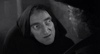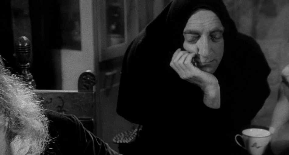 Later that night an elderly blind man prays to god that a companion will eventually join him. The creature then breaks in and the blind man accepts him as his prayer answered and offers food and shelter. At first he tries offering him soup, but he just continually spills it in his lap. He then offers wine but breaks his mug during the toast. Finally, he accidentally lights his thumb on fire while trying to light a cigar, which causes the creature to break out in a rage and leave, much to the blind man's disappointment.