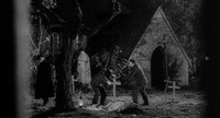 Inside, we find the casket of Baron Van Frankenstein. It suddenly opens as his nearly rotted away skeleton is shown. The camera then pans down to a locked box being held by the bony hands. Two hands then slowly grab the box and try to take it away, but the skeleton still remains attached and pulls it back. It takes another try to get the box back.