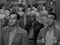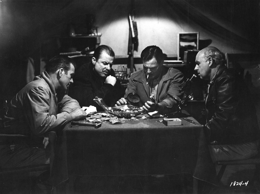 Once this prologue concludes, we are treated to the story proper. Dr. Roger Bentley (John Agar), Dr. Etienne LaFarge (Nestor Paiva) and Dr. Jud Bellamin (Hugh Beaumont, best known as Ward Cleaver from Leave it to Beaver) are leading an archaeological expedition in central Asia. They discover a stone tablet covered in Sumerian cuneiform writing; translating, they find the incredible story of King Sharu, whose dynasty was supposedly washed away by a cataclysmic flood. Sharu's people had instead found refuge on a tall mountain, one not far from their dig site.