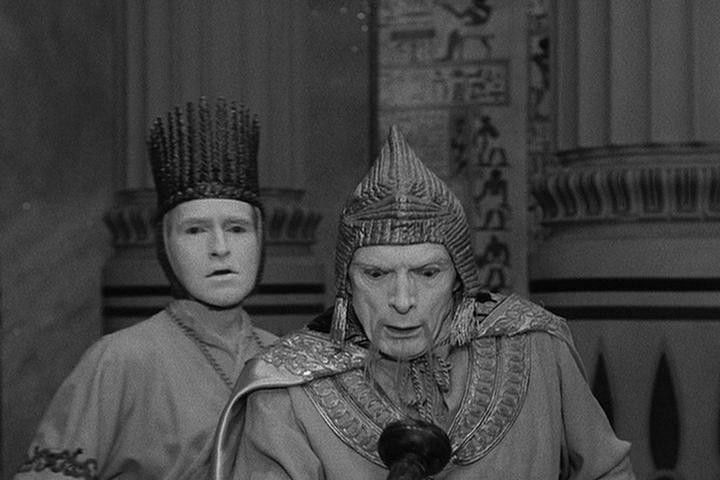 They find significantly more than just artifacts, however. They discover the survival of Sharu's refugees, degenerated into a race of sickly albinos, lorded over by the imperious High Priest Elinor (Alan Napier, best known as Alfred Pennyworth on TV's Batman). Cruel and decadent, these subterranean Sumerians rely on a race of bulging-eyed, claw-fingered brutes - the titular Mole People - as slave labor, harvesting the mushrooms their precarious civilization survives on.