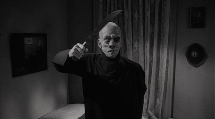 Chapin pays a follow-up visit to Martha, giving her a shot of muscle relaxant and a prescription for sleeping pills. She goes to sleep, but is soon roused by a grisly, hatchet-wielding zombie that chases her around the house until she takes refuge in the bathroom, where the sink and tub faucets immediately fountain forth brilliant scarlet blood - in the midst of a black-and-white film! This proves too much for Martha, who keels over, stone dead.