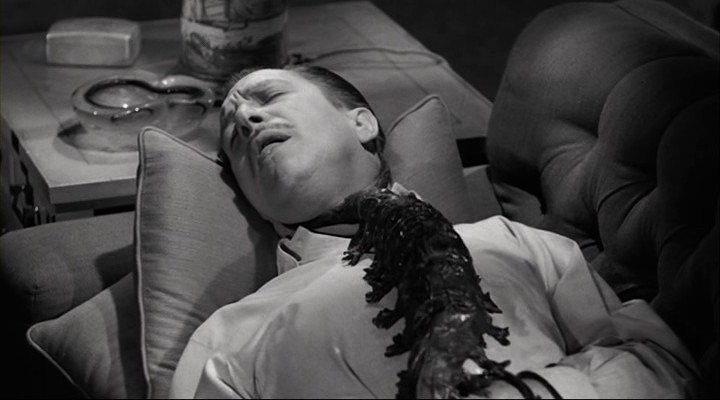 They find, however, that Ollie did not take her body to the morgue. Suspecting foul play, Chapin confronts him, discovering that the nebbish Ollie frightened her to death with a rubber mask. As Chapin moralizes, the Tingler escapes into the theater below the Higgins house.