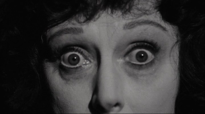 We have two Gimmicks at play here, readers. First off, the bathroom sequence in which vibrantly red blood spills from the faucets. A fairly simple though cunning and sophisticated trick, Castle filmed these sequence using color film stock - and painted the set (and Judith Evelyn) in grayscale. It matches beautifully, though if you look closely at the chrome of the faucets, you can see the deception.