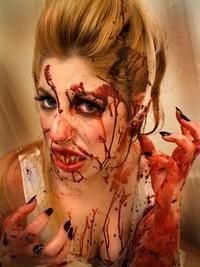 RB: Well, with AUNT ROSE and BARRICADE, I played victims and in 100 TEARS I was the perpetrator. I must say that I really do like doing the gory scenes because when I'm doing these scenes, it's actually a lot of fun. The preparation before and getting covered with goo, I enjoy that. It's actually hard for me to watch movies like this that I'm not in, but the films that I make are fun to do. Once I get into the zone where I have to be terrified, though, it is exhausting, because there are a lot of emotions that I have to go through.