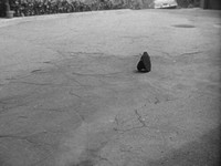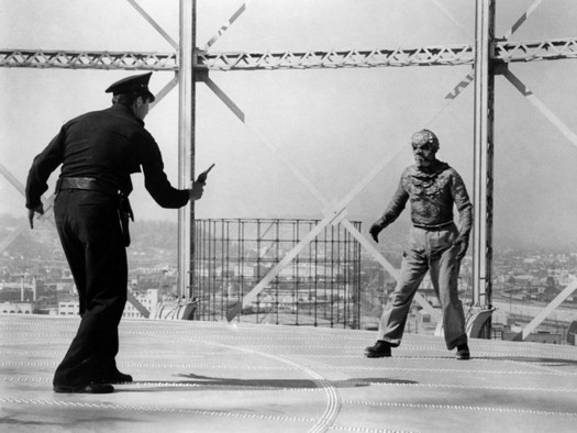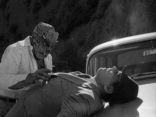 George shows up at her apartment, marching McKenna outside at gunpoint, where the sunlight turns George's gun from a Colt 1911 to a Luger, and McKenna from a wimpy, handsome scientist into a ravening lizard-man. With George dead, McKenna goes on a rampage across the bleak landscape of the Los Angeles oil fields. He terrorizes women and children, tears apart a German Shepherd, and while hiding in a shack, befriends the most irritating child this side of the Gamera franchise.