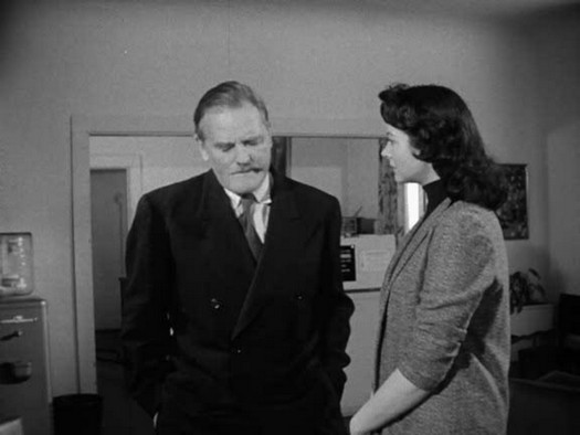 Dr. Frederick Buckell, McKenna's superior, discusses the matter with his attending physician, and reveals that the isotope whose rays McKenna had received was artificial, never having existed in nature. He also reveals, in calmly discussing the situation with McKenna's assistant (and apparent schnoogie-woogums) Ann Russell (Manning) that the accident is McKenna's own fault - McKenna was hung over on the job! "Whiskey and soda mix, not whiskey and science!" Buckell moralizes.