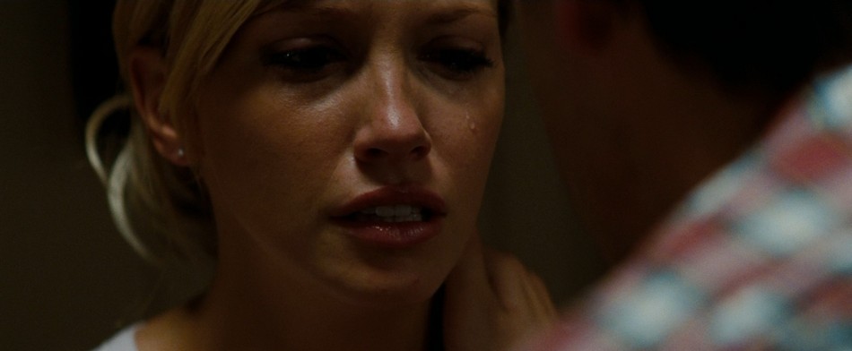 On fair Elm Street is where we lay our scene. Dean (Kellan Lutz) is being tormented by nightmares of a man burnt to the core. Wielding razor sharp knives as fingers, he's trying to kill him, and kill him he does. Well, at least he makes it out that Dean went off the deep end and slit his own throat in front of everyone, but hey it's just the opening scene. Next up is Kris (Katie Cassidy) who was in a conversation with Dean right up until he turned himself into a cadaver who begins to speak of her own nightmares, the same which Dean spoke of. When compared to the original, Kris' character is obviously based on Tina, the doomed ceiling bleeder that gave the first 'Nightmare' its charm - and yes Kris does fly up the walls and ceiling right before she is gutted by Krueger, so far the first stolen scene from its predecessor.